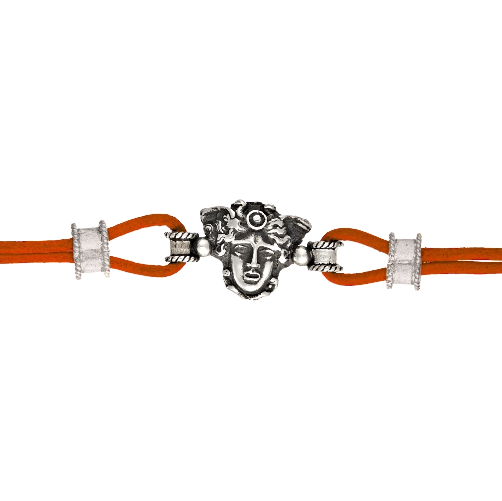 Questo straordinario bracciale realizzato in argento 925/°° e cuoio, raffigura il volto di Medusa, la leggendaria Gorgone della mitologia greca.