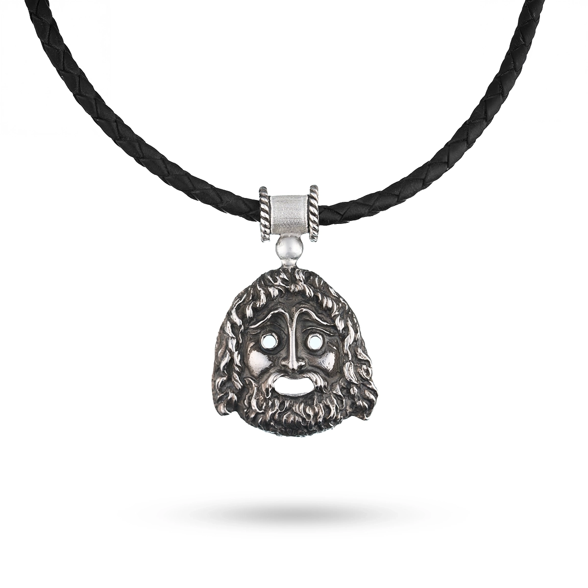 Collana in cuoio intrecciato con ciondolo 2° misura “Maschera Eroe” realizzato in argento 925/°°.
